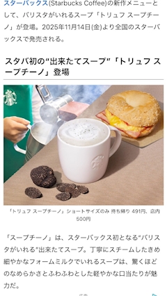 スタバにスープが出るらしい!! トリュフスープだって😳! これから寒くなるし、これはとても楽しみ🥺✨ どんな感じの味なんだろ👀? スタバからスープは初だね😳 新作のフラペチーノも気になってるけど、いつも寒くて凍えてるからなかなか飲むタイミングが見つからない😂 でもみんなブログ載せてて可愛いし美味しそう😋❤️ 新作のやつも、このスープも絶対飲みたい🤤❤️ ちゃお しーくらぶれいさま