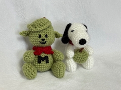 スヌーピーに🍏もたせたやつも 編んでみた☺️かわいいコンビ😊 そして背景‼️‼️(笑) いつも背景困ってたんだけど 300円のバスタオルかってハンガーに かけて撮ってみたらいい感じ!(笑) 今日も出勤でござんす